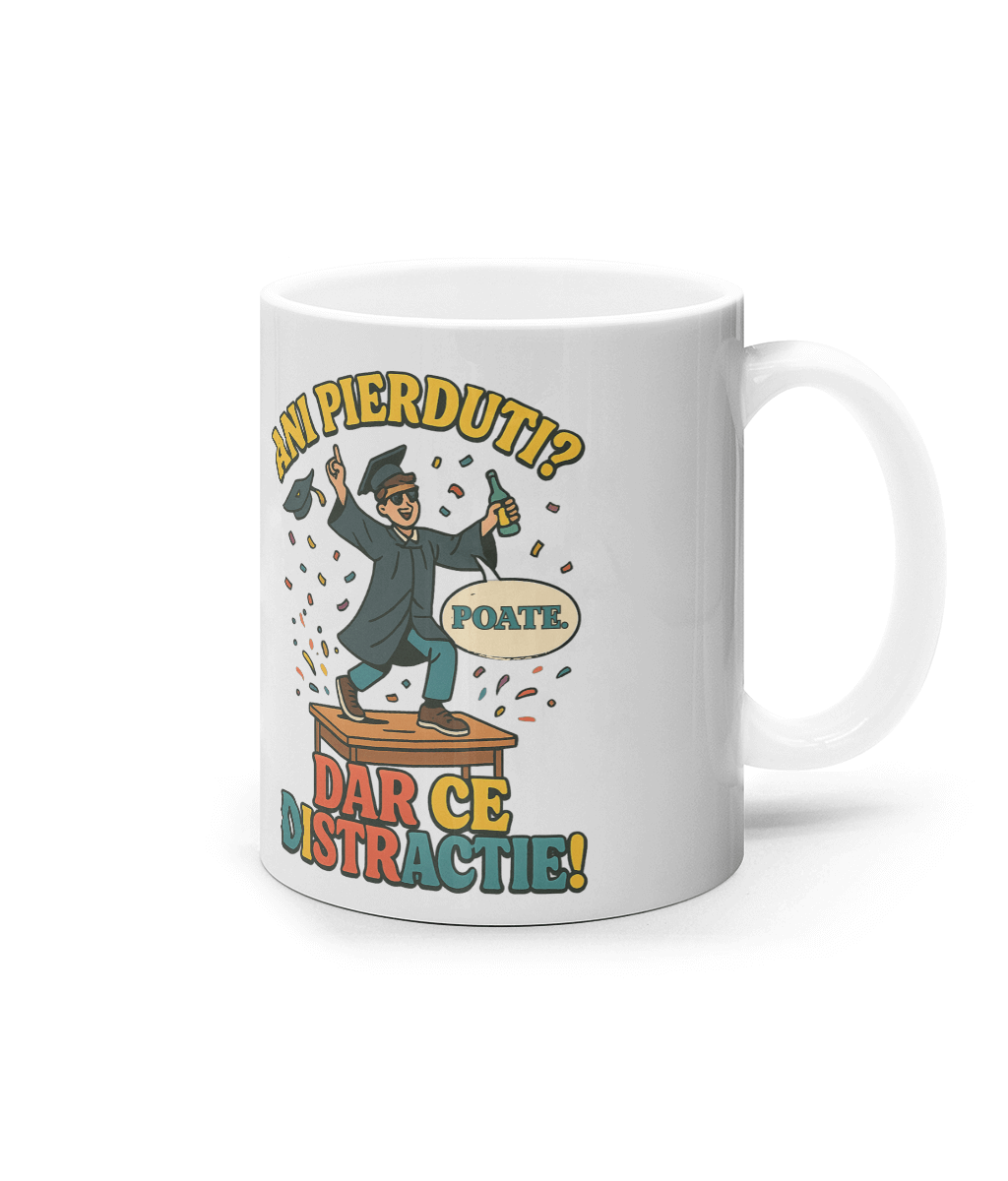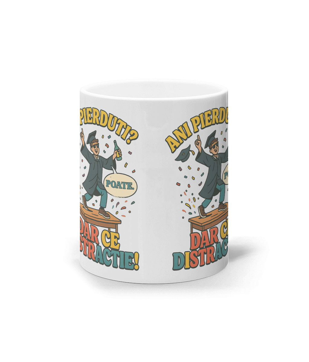 🎉 Cană „Ani pierduți? Poate. Dar ce distracție!” – Pentru absolvenții cu povești de neuitat