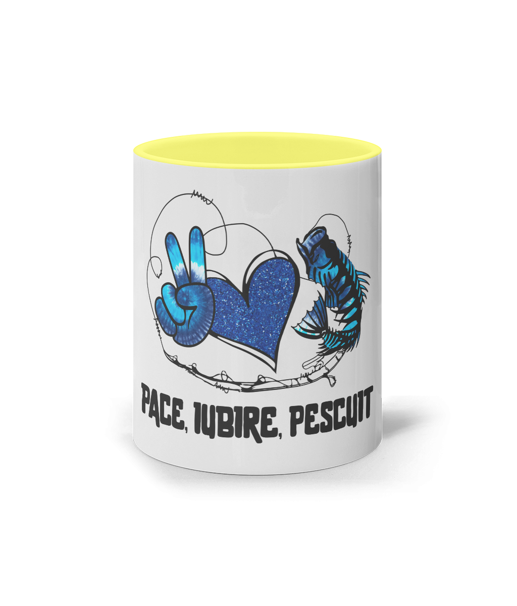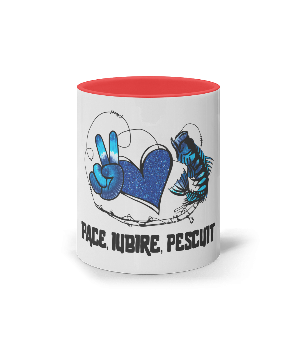 Cană ceramică colorată „Pace, iubire, pescuit”