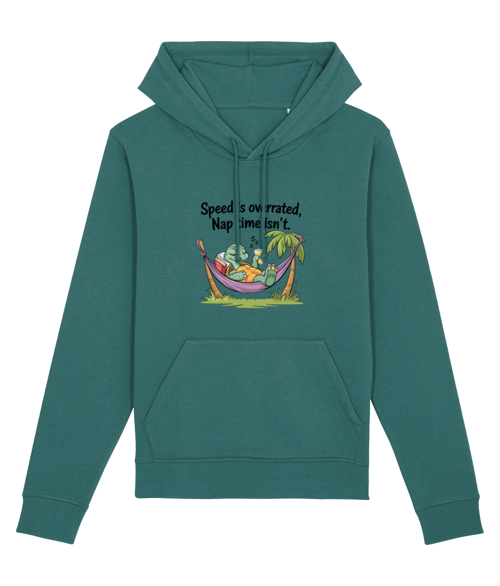 A venit momentul să te îmbraci în starea ta de spirit preferată: relax total. Cu designul simpatic al unei broaște țestoase care doarme liniștită într-un hamac și mesajul „Speed is overrated. Nap time isn’t”, acest hanorac este tot ce ai nevoie pentru zilele în care lumea se mișcă prea repede și tu vrei doar… să tragi un pui de somn.