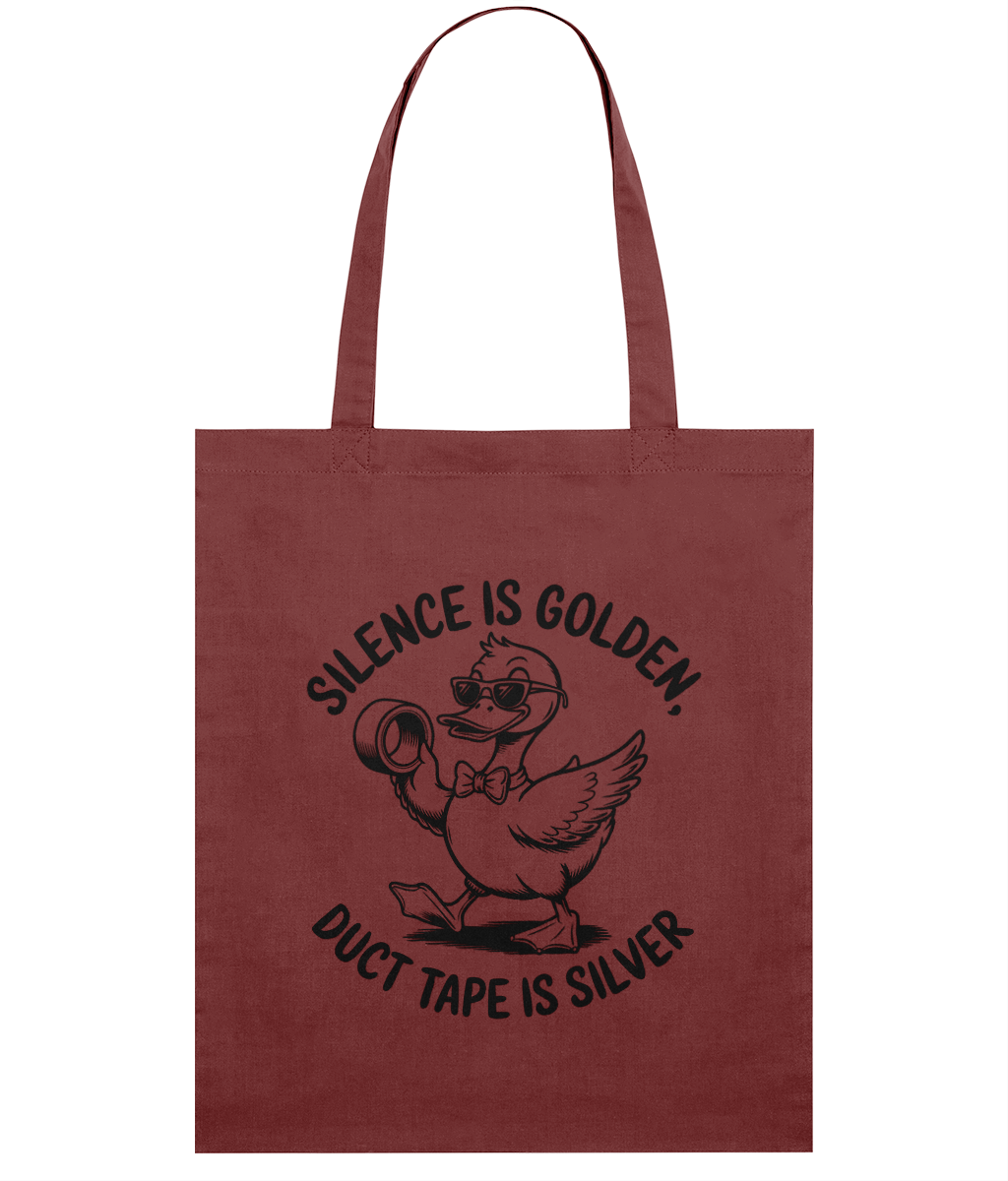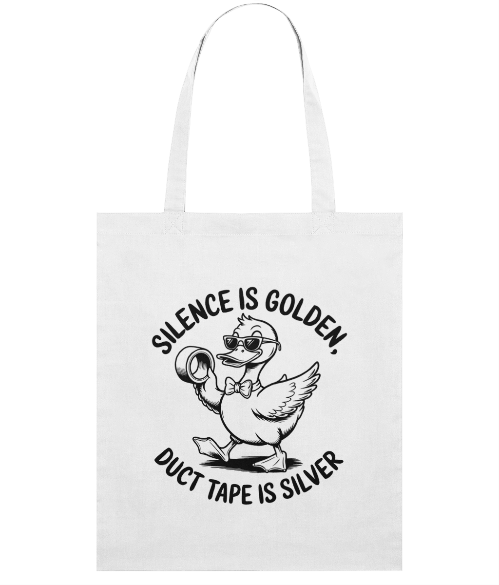 🛍️ Sacoșă din Bumbac „Silence is Golden, Duct Tape is Silver” – Cadoul Perfect pentru Iubitorii de Sarcasm! 🦆🖤