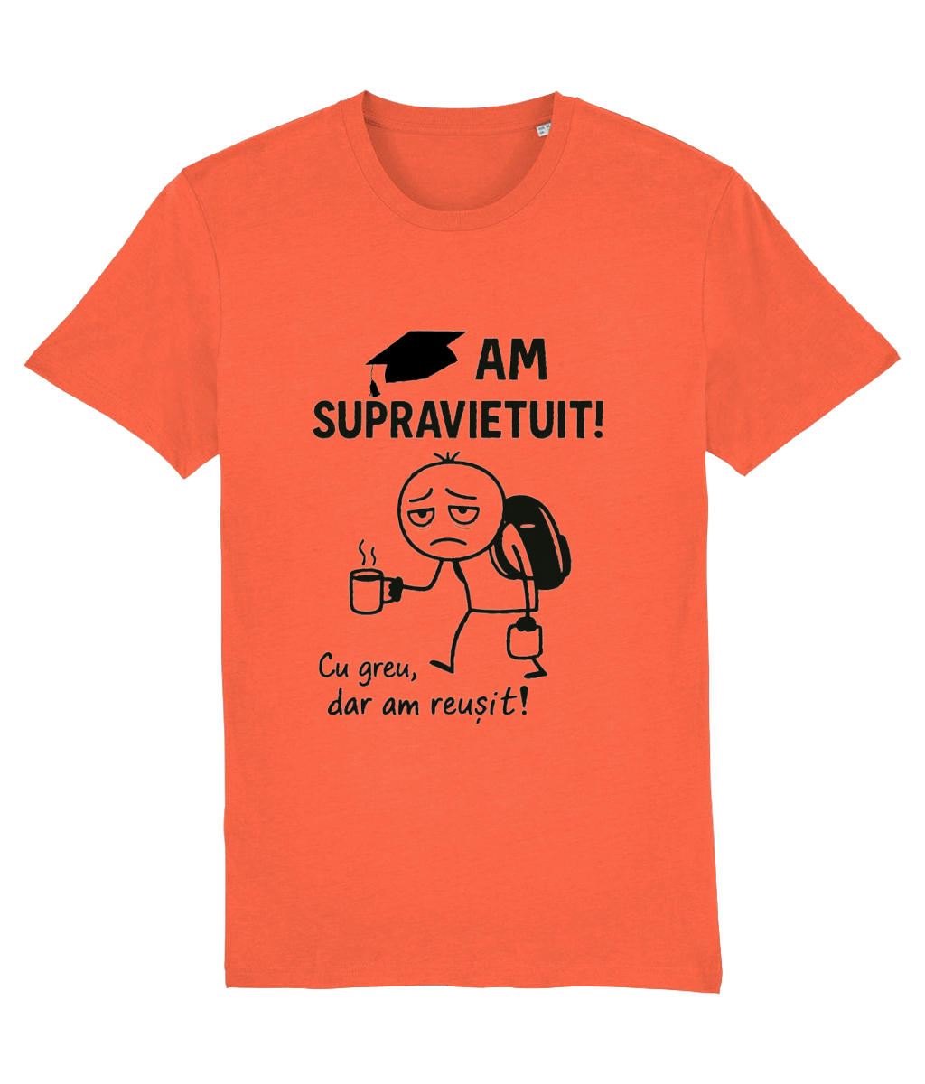 A trecut prin sesiuni, proiecte imposibile, 3 mii de pagini de învățat și 10 mii de cafele băute. Dar a reușit! Tricoul „Am supraviețuit! Cu greu, dar am reușit!” spune povestea fiecărui student care a tras tare și acum merită o diplomă, o pauză și o îmbrățișare. Ilustrația haioasă cu personajul epuizat, dar triumfător, și toca de absolvent deasupra, face din acest tricou un cadou memorabil, comod și cu personalitate.