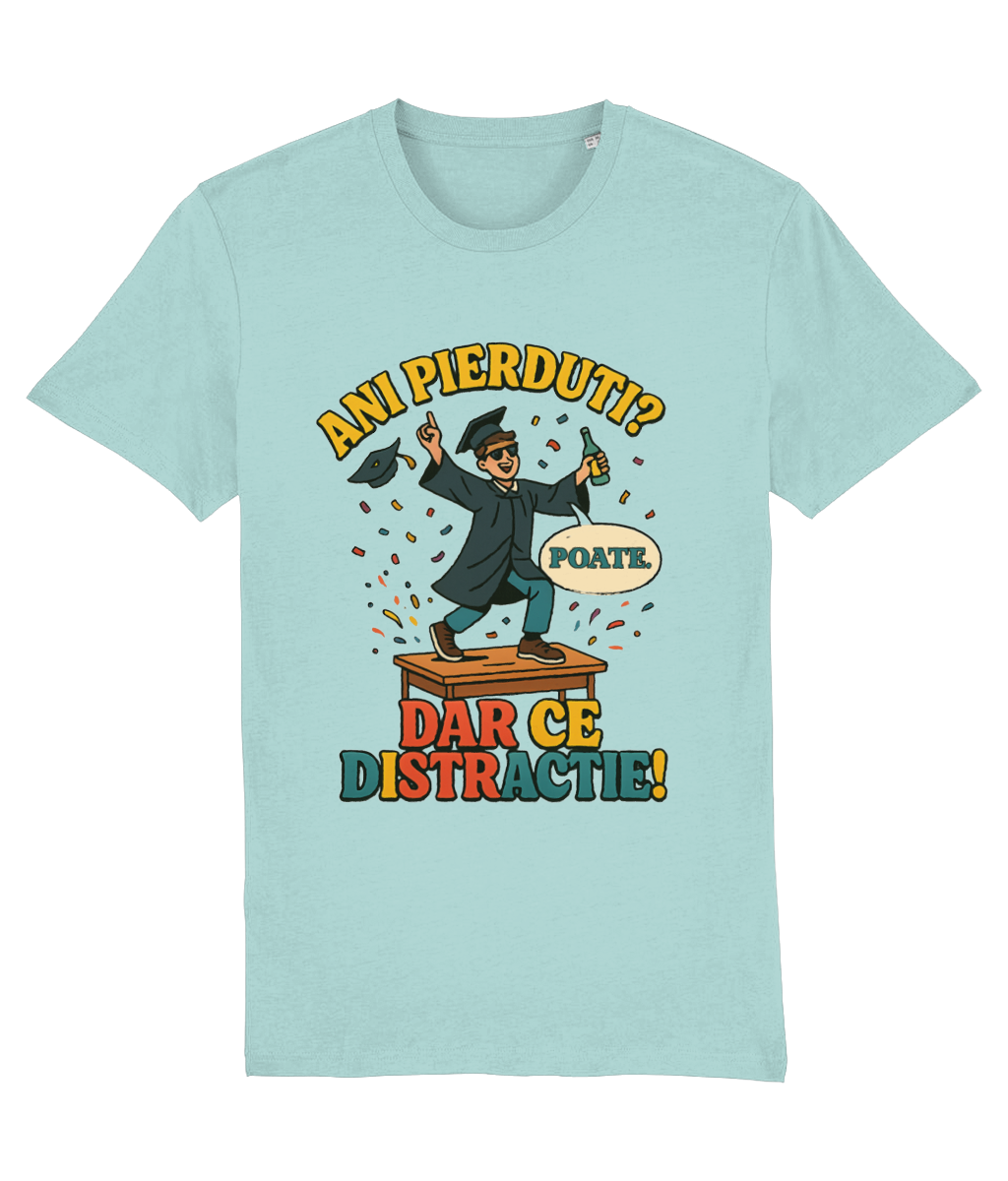 Școala a fost o provocare? Sigur. Dar și o aventură de neuitat! Tricoul „Ani pierduți? Poate. Dar ce distracție!” surprinde exact sentimentul acela amestecat de nostalgie, umor și bucurie de a fi trecut prin tot. Cu un absolvent dansând pe o bancă, înconjurat de confetti, designul spune totul fără prea multe cuvinte. Este cadoul perfect pentru colegul vesel al grupului, pentru cel care a făcut anii de școală mai suportabili – și memorabili!