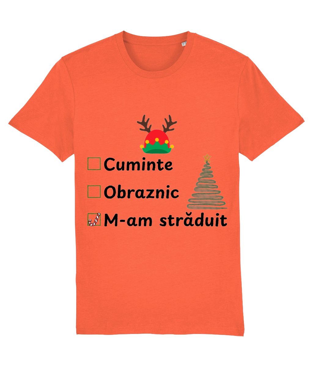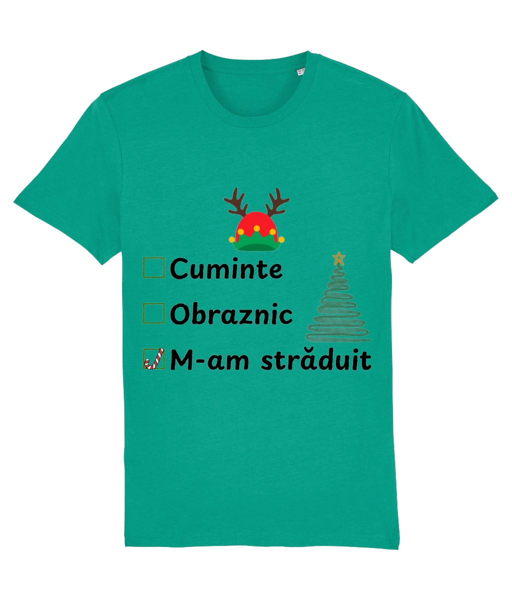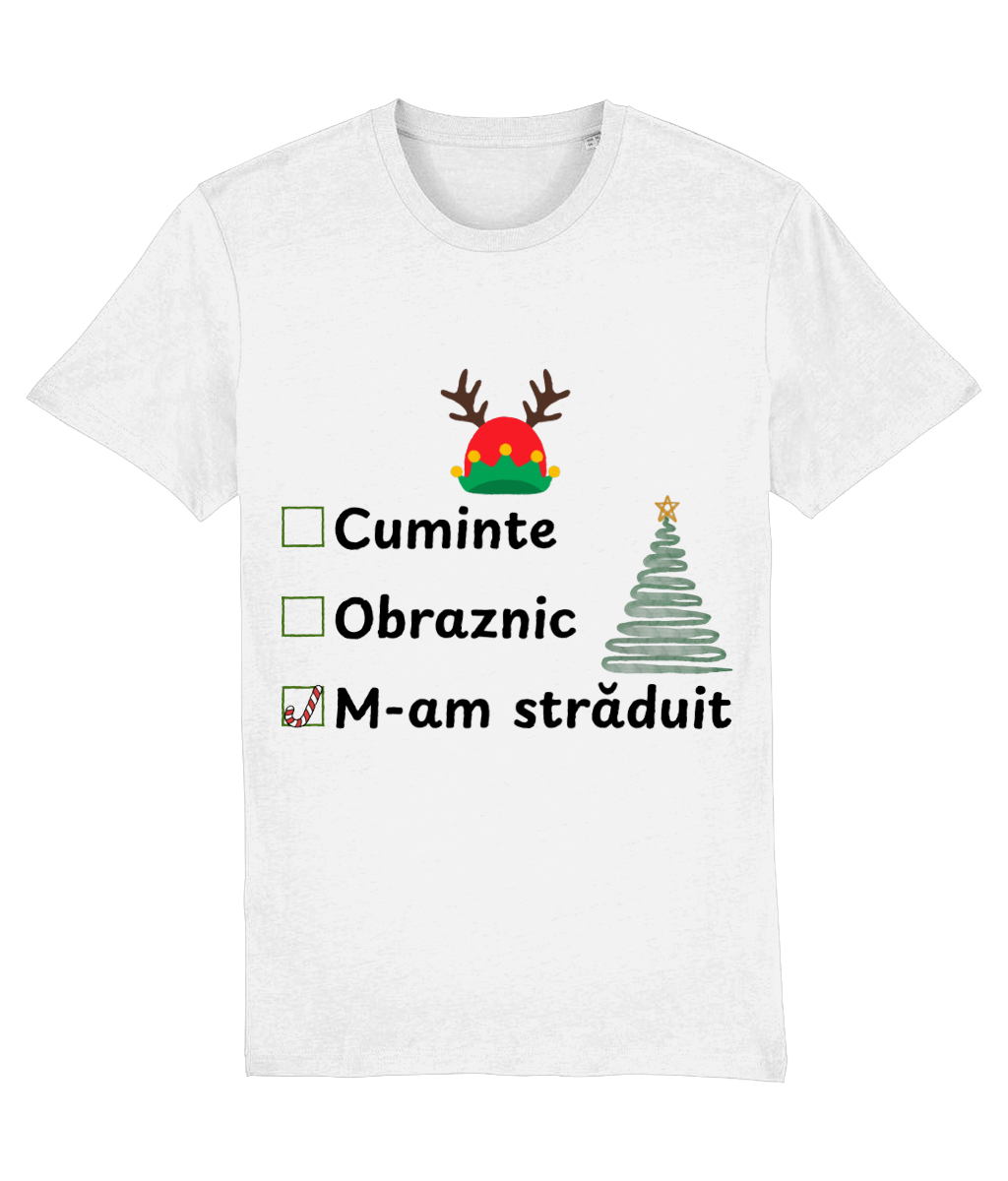 Tricoul „Obraznic, cuminte, m-am străduit” surprinde perfect realitatea de decembrie: trei căsuțe de bifat, iar singura marcată este „m-am străduit”, cu un candy cane simpatic în loc de bifă. Completat de un brad stilizat și o căciulă de elf cu coarne de ren, designul are exact doza de umor și spirit de sărbătoare de care ai nevoie.