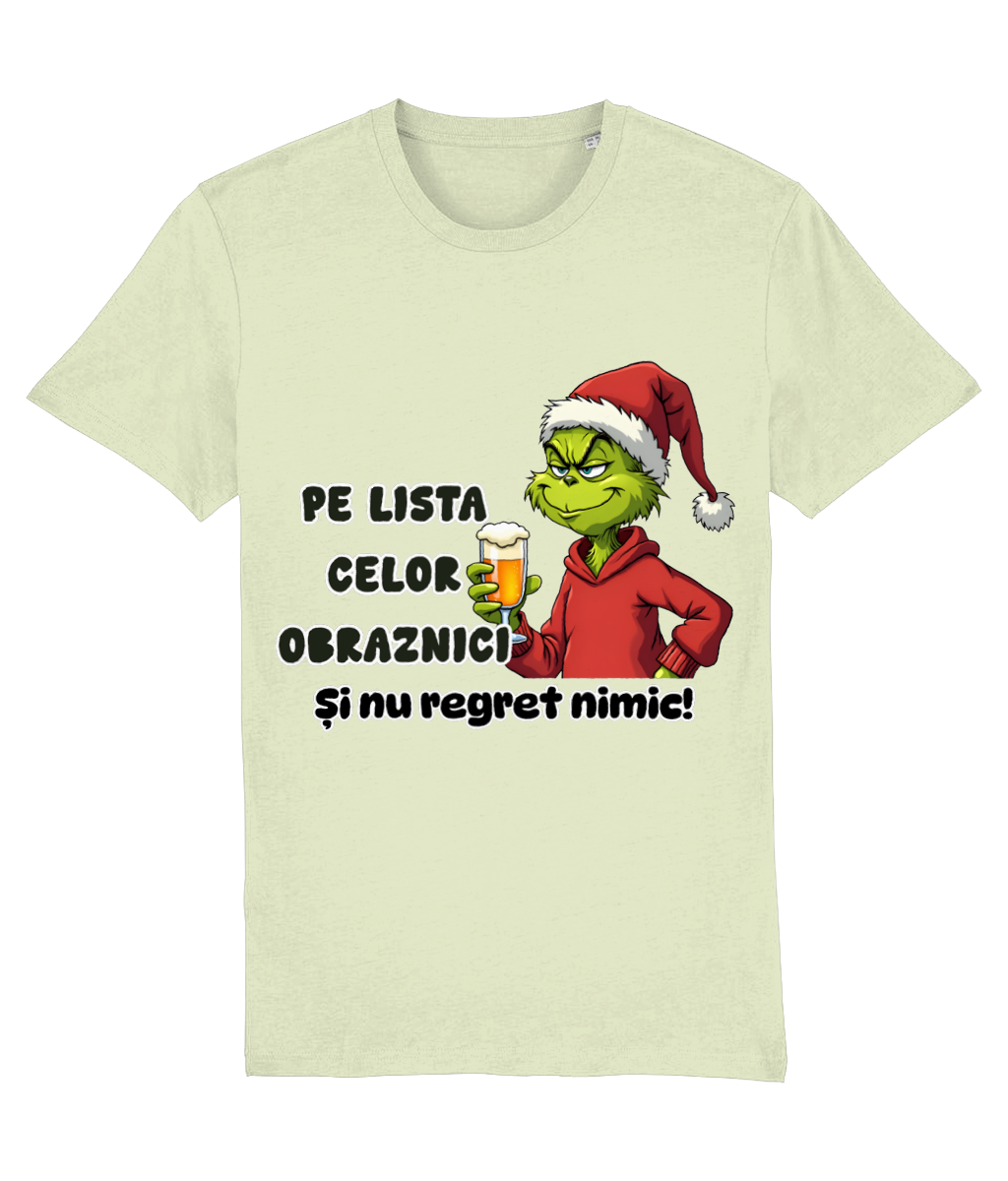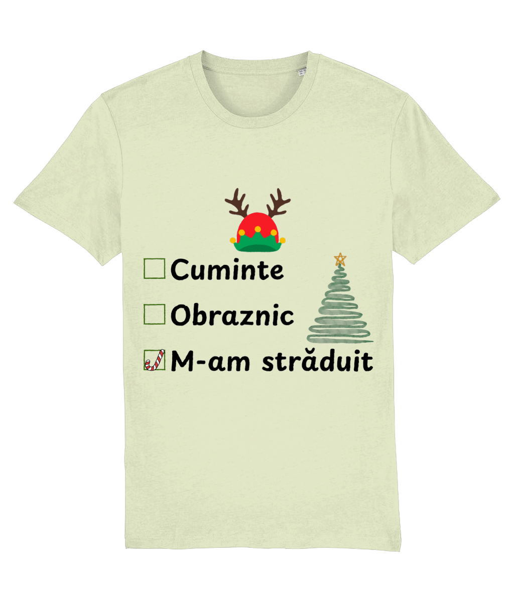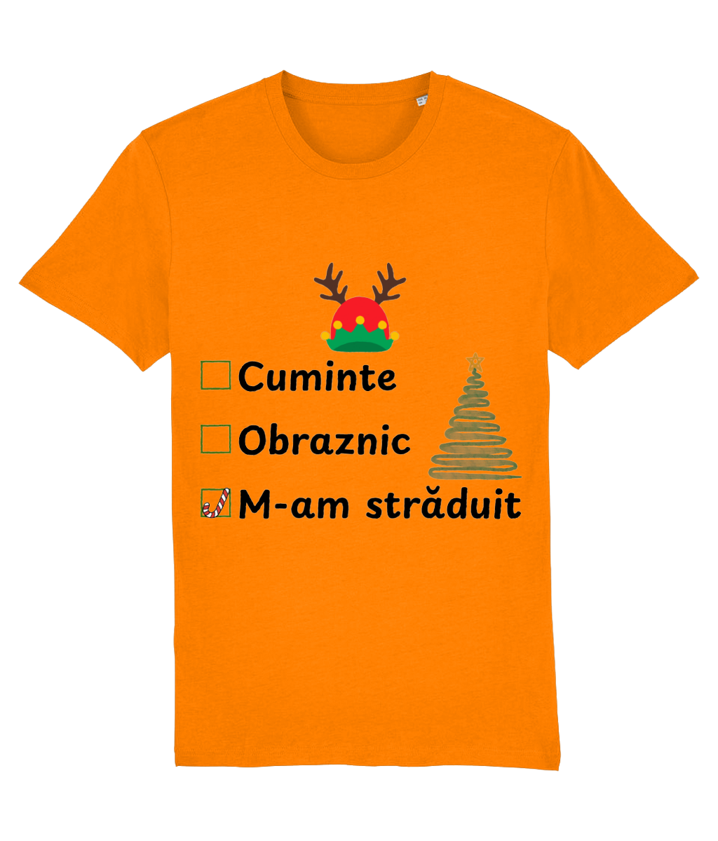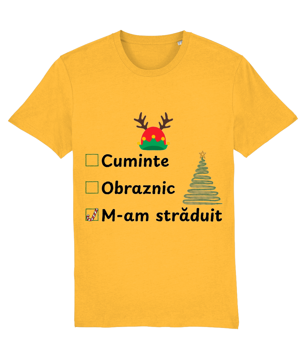 Tricoul „Obraznic, cuminte, m-am străduit” surprinde perfect realitatea de decembrie: trei căsuțe de bifat, iar singura marcată este „m-am străduit”, cu un candy cane simpatic în loc de bifă. Completat de un brad stilizat și o căciulă de elf cu coarne de ren, designul are exact doza de umor și spirit de sărbătoare de care ai nevoie.
