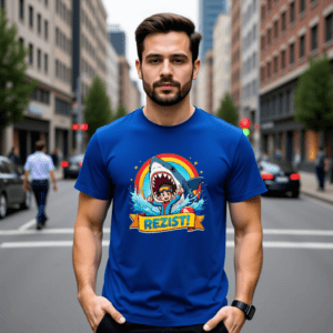Tricou unisex „REZIST!” – Curaj, culoare și umor în fața oricărui rechin